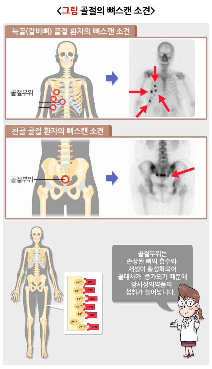 뼈스캔의 영상에서는 뼈 전이 여부 및 치료 후 병변의 변화 확인이 가능할 뿐만 아니라, 최근에 일어난 외상(상처)도 쉽게 관찰됩니다. 따라서 정확한 판독을 위하여 최근에 일어난 외상이나 타박상, 수술, 암 치료 과정에 관한 정보로 보다 정확한 판독을 할 수 있습니다.
