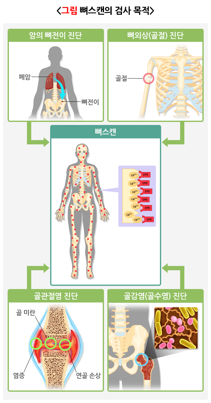 뼈스캔은 전신의 뼈에서 골대사의 이상소견을 영상으로 확인하는데 이용되며, 다음과 같은 임상 목적으로 주로 이용됩니다.