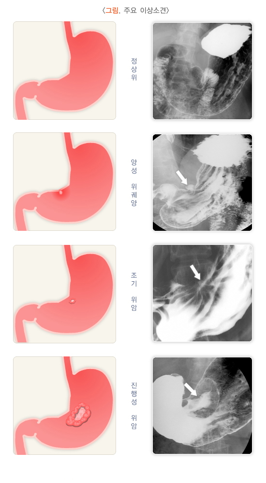 4. 상부 위장관 촬영은 위암, 특히 조기 위암의 진단에 있어서는 위내시경 검사에 비해서 진단율이 낮은 검사이므로, 이상 소견이 발견되어 조직 검사가 필요한 경우에는 내시경을 추가로 시행해야 합니다.
