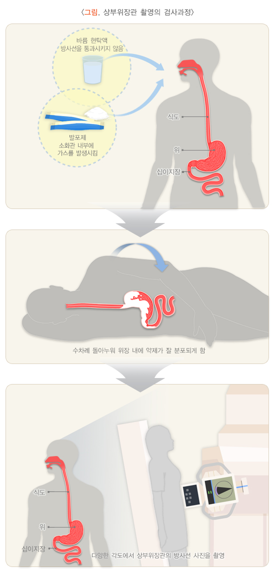 촬영실에 도착하면 방사선 촬영기계 테이블에 누워 흰색의 바륨 현탁액 한 컵과 공기를 발생시키는 발포제 한 포를 같이 복용합니다. 발포제를 먹은 후에는 트림을 참고, 말을 하거나 입을 벌리지 않아야 위장관이 충분히 팽창되어 검사가 잘 됩니다. 위장벽에 약제가 잘 분포되도록 촬영기 위에 누운 상태에서 지시에 따라 좌우로 여러 차례 몸을 굴립니다. 검사를 시행하는 동안 모니터를 통해 위장을 실시간으로 관찰하면서 여러 자세에서 촬영을 합니다. 이때 환자가 누운 테이블의 각도를 조절하여 머리나 발쪽으로 기울기도 하며, 테이블을 완전히 세워서 선 자세로도 촬영합니다. 위장벽의 병변을 자세히 보기 위해 촬영기에 장착된 압박기를 이용해 배를 누르기도 합니다. 촬영 동안에는 의사의 지시에 따라서 숨을 잘 참도록 합니다.