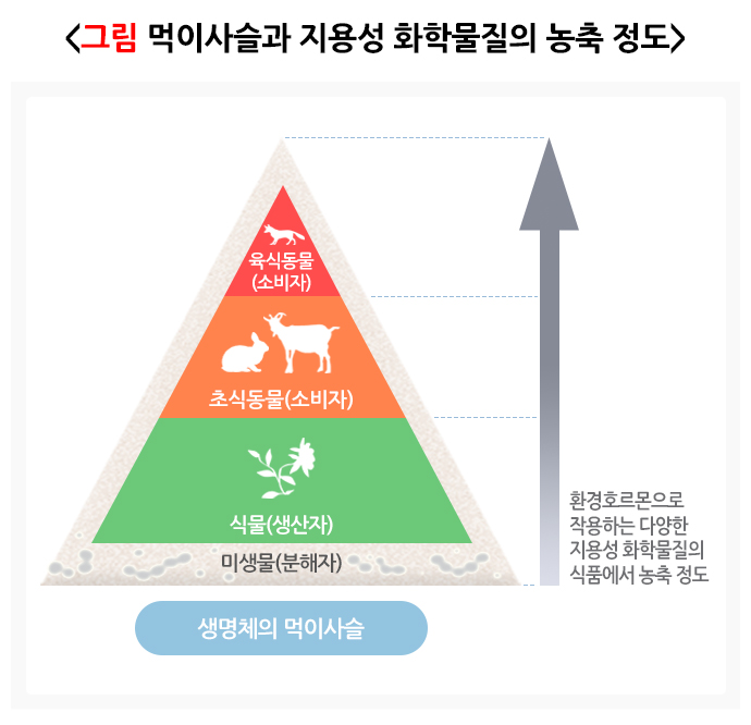 화학물질 중에서도 지용성이 높으면서 지방조직 내에서 반감기가 매우 긴 것들은 환경호르몬으로서 문제가 더 큽니다. 지방조직에 축적된 화학물질은 정상적인 지질대사와 함께 지속적으로 인체에 다양한 영향을 미칩니다. 이러한 지용성 화학물질은 수많은 화학물질의 혼합체로 존재하면서 동물의 지방조직에 축적되고 먹이사슬을 통해 농축되는 특성이 있습니다. 따라서 먹이사슬의 상층부를 차지하는 지방이 많은 동물성 식품을 피하는 것은 다양한 환경호르몬 노출을 전반적으로 낮출 수 있는 방법입니다.