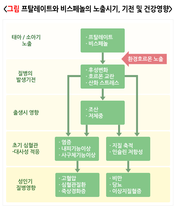 플라스틱에서 유래한 생활화학물질 중 대표적인 환경호르몬인 프탈레이트와 비스페놀에 노출되면 후생유전학적 변화, 호르몬 장애, 산화 및 질산화 스트레스 등 여러 가지 경로를 통해 건강 영향이 나타난다고 생각됩니다. 특히 태아 시기 노출은 조산 및 저체중과 관련이 있으며, 모두 심장대사 기능장애와 연관됩니다. 아동기 노출 또한 심혈관 및 대사 기능장애의 조기 징후와 관련이 있습니다. 태아기와 아동기 노출은 모두 성인기에 심혈관 및 대사 질환의 위험을 증가시킬 수 있습니다.
