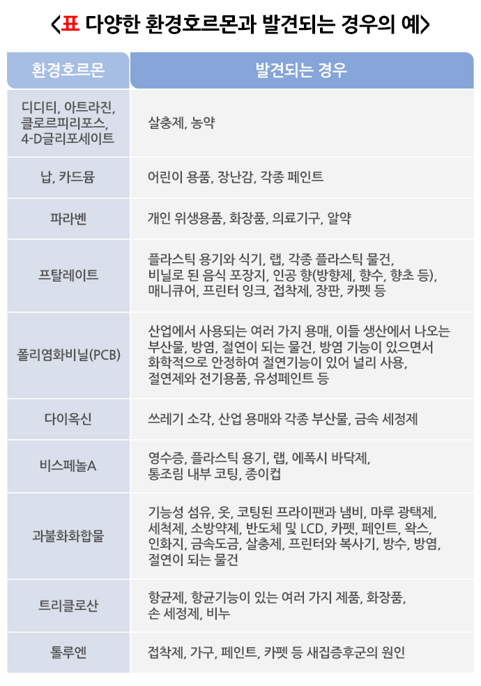 현재 환경호르몬으로 분류되는 화학물질의 노출경로는 식품을 통한 섭취, 호흡, 피부 접촉 등 매우 다양하며, 노출경로 대부분은 우리 일상생활 속에 광범위하게 존재합니다. 환경호르몬으로 알려진 화학물질의 화학적, 물리적 특성은 매우 다양합니다. 구체적인 예로 살충제 및 제초제 등 농약류, 다이옥신류, 플라스틱 원료물질, 중금속 등 다양한 산업용 화학물질을 들 수 있습니다.