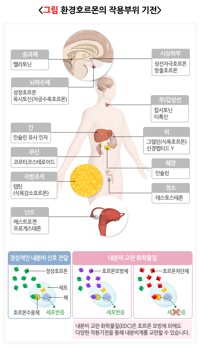 환경호르몬은 시상하부, 뇌하수체, 부신, 갑상선/부갑상선 등의 다양한 내분비기관과 정소/난소 등 생식기계의 다양한 특정 호르몬 수용체에 직접 결합해 호르몬과 유사한 역할을 하거나, 호르몬 수용체를 차단해 호르몬이 제 역할을 하지 못하도록 합니다. 다양한 인체 호르몬 중 여성 호르몬인 에스트로겐과 비슷한 역할을 하는 화학물질이 가장 많이 알려져 있습니다.
