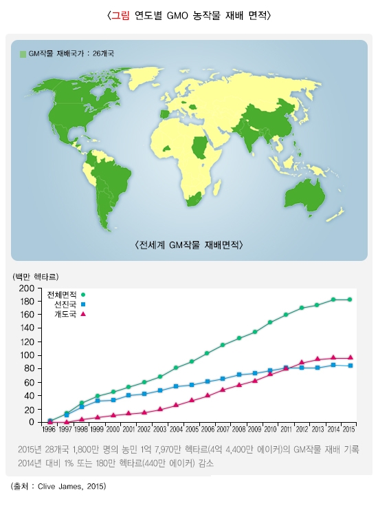 유전자재조합생물체(Genetically Modified Organism, GMO)는 유전적 형질(모양과 성질)이 자연적으로는 일어나지 않는 방법으로 변형된 생물입니다. 유전자재조합생물체는 종류에 따라 유전자재조합농산물, 유전자재조합동물, 유전자재조합미생물로 분류합니다. 유전자재조합농산물을 원료로 제조, 가공한 식품 및 식품첨가물을 유전자재조합 식품이라고 합니다. 매년 유전자재조합 농산물을 재배하는 곳이 증가하고 있으며, 유전자재조합 식품은 식약처(식품의약품안전처)에서 승인한 표시를 하도록 되어 있습니다.