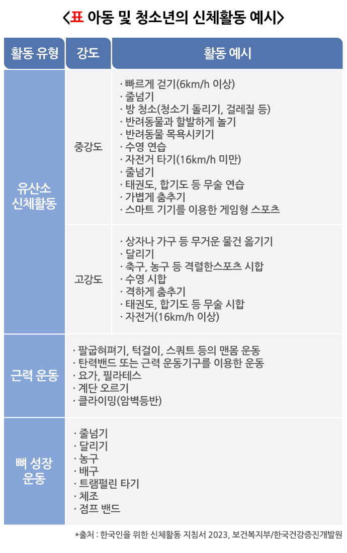 활동적인 습관을 들이는 것이 중요합니다. 아동과 청소년기의 신체활동 지침은 다음과 같습니다.