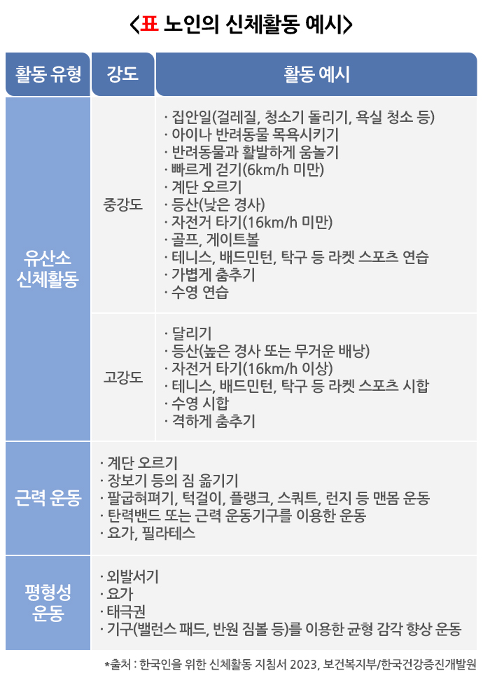 도움이 됩니다. 노인의 신체활동은 다음과 같은 지침을 따르는 것이 좋으며, 권장