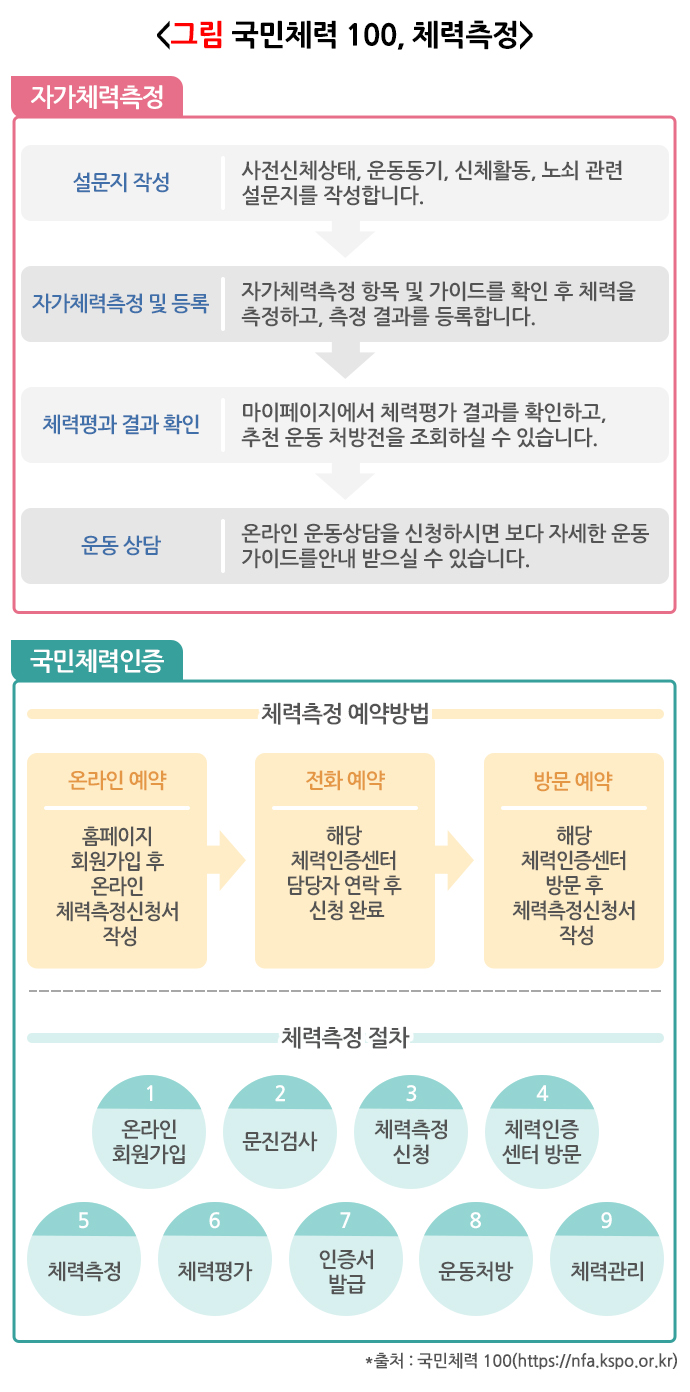 국민체력 100 사업의 체력 측정 및 운동 프로그램 처방을 이용할 수 있습니다. 홈페이지 및 전화(1644-7110) 또는 가까운 체력인증센터를 방문하여 국민체력인증 검사를 받고 결과에 따라 운동 처방 및 체력 관리가 가능하며, 체력 측정을 받으러 가기가 어려운 경우에는 홈페이지에서 자가 체력측정 서비스를 활용할 수 있습니다.