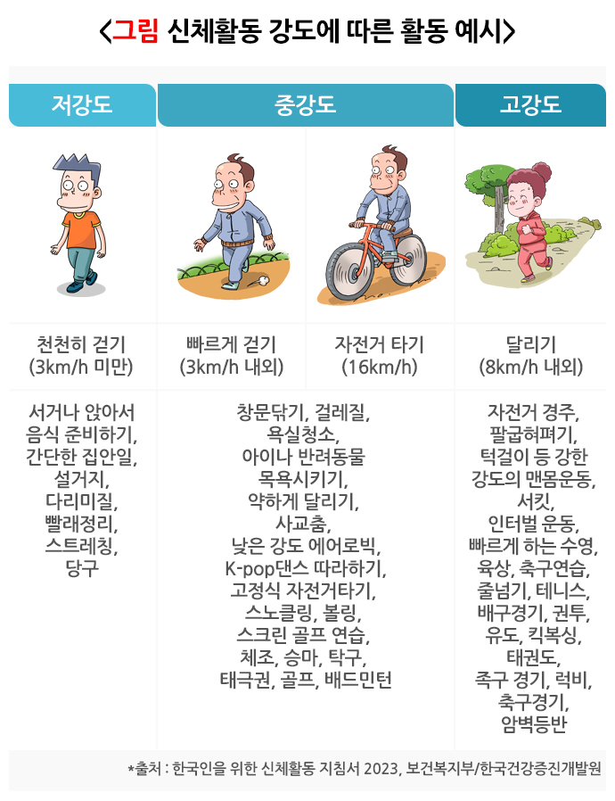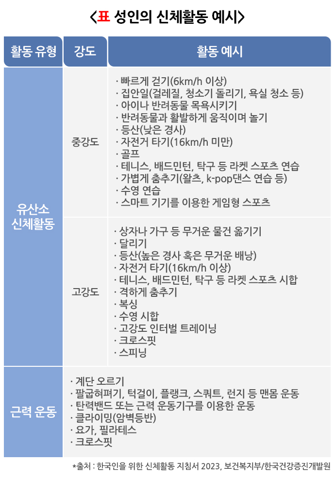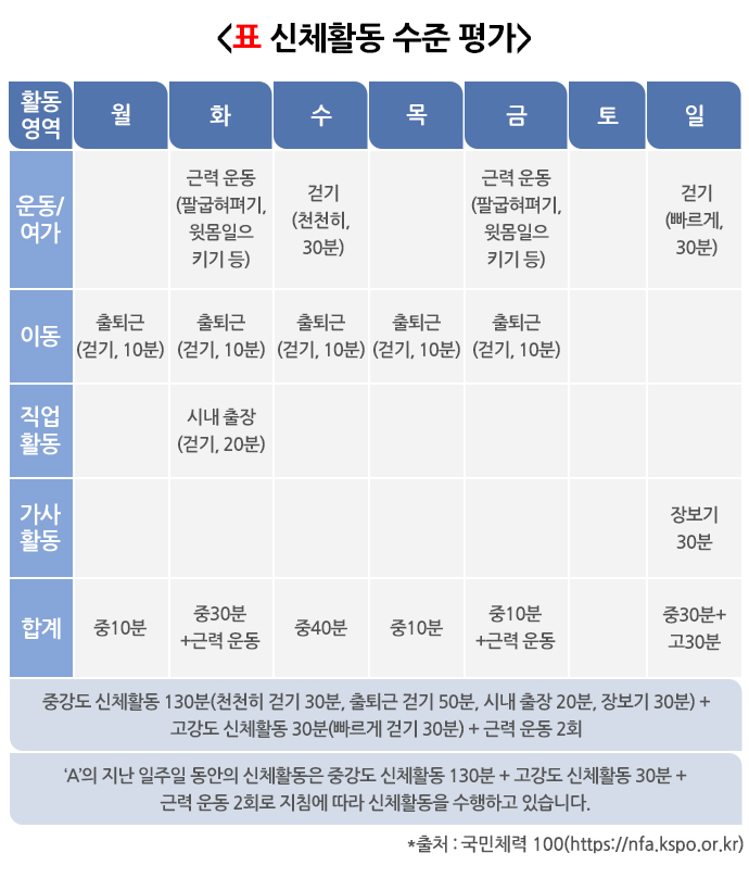 ② 신체활동은 여가 시간의 운동, 이동을 위한 걷기나 자전거 타기, 직업 활동(노동), 집안일 등을 포함하며 전반적으로 활동적인 습관을 들이는 것이 중요합니다.