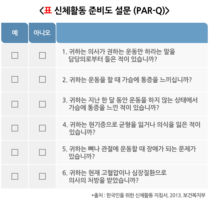 위의 질문 중에서 하나라도 ‘예’ 라고 대답한 경우라면, 강도 높은 신체활동을 시작하기 전에 의사를 방문하여 본인이 ‘예’ 라고 대답한 항목에 대해 상담하고 신체활동을 시작해도 좋은지에 대한 확인이 필요합니다. 만약, 모두 '아니오' 라고 답한 경우라면 강도 높은 신체활동을 시작할 수 있지만, 반드시 점진적으로 강도를 높여가면서 신체활동을 시작하는 것이 중요합니다.