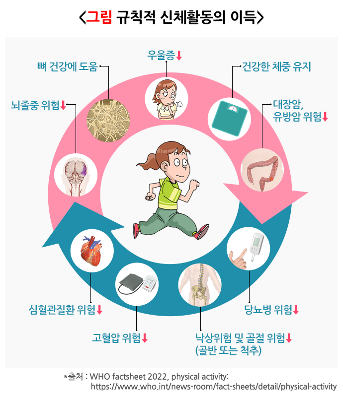 ① 규칙적인 신체활동은 건강을 증진시키고 체력을 향상시키며 여러 가지 만성 질환을 예방합니다.