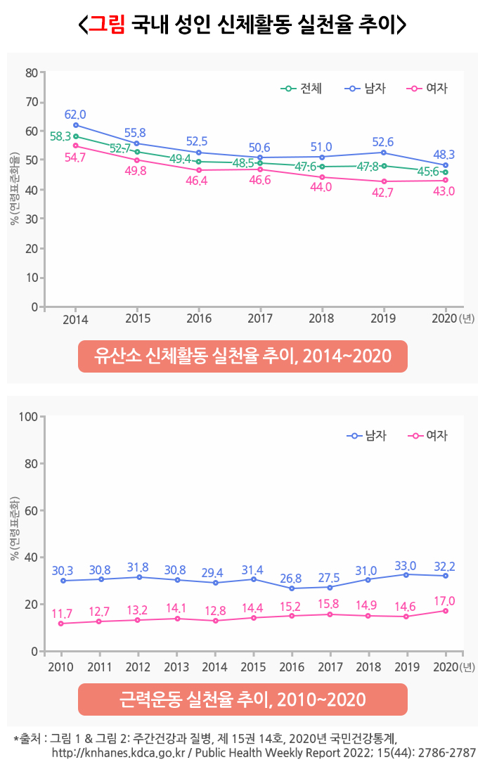 국내 통계에 따르면, 성인의 유산소 신체활동 실천율은 2014년 58.3%에서 2020년 45.6%로 감소 추세를 보이고 있습니다. 한편, 근력운동 실천율의 경우에는 2010년 남자 30.3%, 여자 11.7%였던 것이 2020년에는 남자 32.2%, 여자 17.0%로 증가하는 추세입니다. 하지만 유산소 및 근력운동 실천율 모두 50% 미만으로 조사되어 보다 규칙적인 신체활동이 필요합니다.