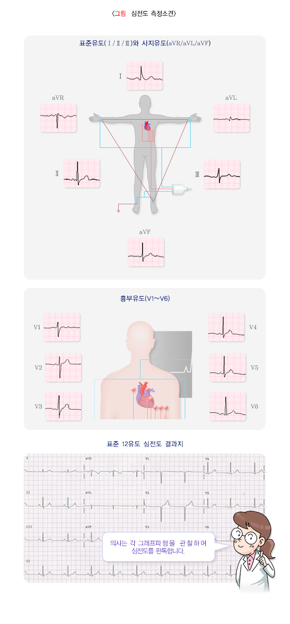 하지만 정상인 경우에도 위의 질병이 있을 때 나타나는 모양과 유사한 심전도 소견이 나올 수 있습니다. 따라서 심전도 검사에서 문제가 보이면 전문의에게 진료를 받아 심전도의 비정상 소견이 중요한 문제인지 아닌지 확인해야 합니다.