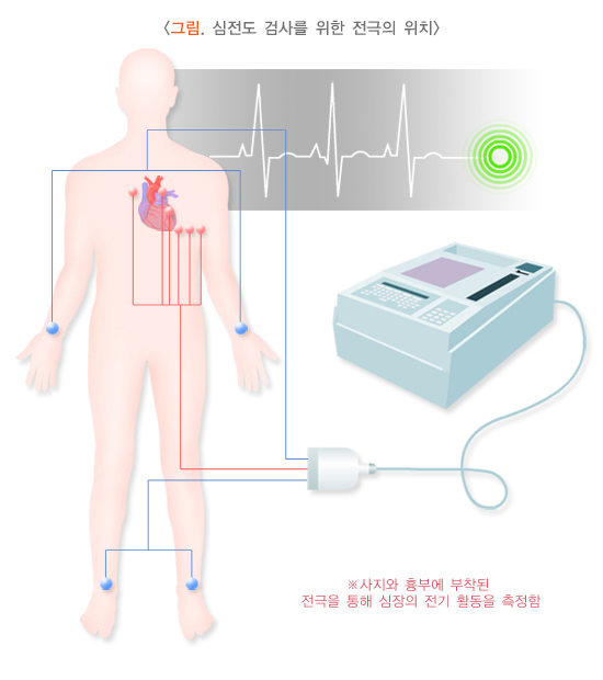 환자가 침대에 누우면 알코올 솜으로 전극을 붙일 피부 부위를 닦아 분비물을 제거합니다. 그 다음 전기 신호를 잘 전달하기 위해 전극연고나 젤리를 발라줍니다. 표준 심전도 검사에서는 그림과 같이 양쪽 팔목과 발목, 가슴 부위 6곳에 총 10개의 전극을 부착합니다. 이 검사는 5분 이내에 끝납니다.