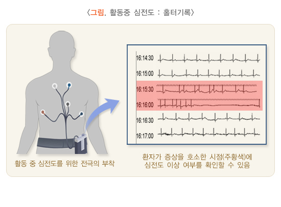 심전도, 운동부하심전도, 활동중심전도, 홀터검사, 사건기록계, 부정맥, 협심증, 심근경색증