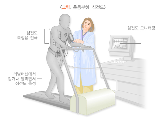 러닝머신과 비슷한 기계 위에서 처음에 천천히 걷다가 점차 빠르게 걷거나 뛰면서 검사합니다. 운동하는 동안 계속 심전도를 모니터링하고 혈압을 측정합니다. 만약 뛰는 동안 가슴에 통증이 생기거나 호흡곤란이 생기면 검사를 중단해야 합니다.