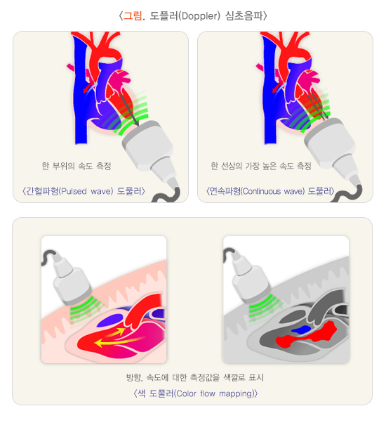 도플러 효과란 소리를 발생하는 음원이 소리를 듣는 관찰자로부터 멀어질 때 소리의 주파수가 감소하고 가까워질 때 증가하는 현상으로, 사이렌을 울리며 달려오는 구급차의 사이렌 소리가 높게 들리다가 지나가면 소리가 낮아지는 현상이 도플러 효과에 의한 것입니다. 도플러 현상을 이용한 것이 도플러 심초음파인데, 우리의 심장 내 혈액의 이동 속도에 따른 주파수 변화를 기록하여 혈류 속도를 측정할 수 있습니다. 이를 이용하여 혈류역학적인 정보, 심박출량, 혈류량, 판막의 면적 및 심장 내 압력 등을 측정할 수 있습니다.