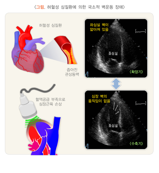 허혈성 심질환에서는 심장의 국소적인 심장벽의 움직임 장애를 확인할 수 있으며, 특히 사망률이 높은 심근경색의 감별진단에서 중요한 역할을 합니다.