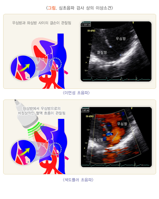 상의를 벗은 상태에서 가슴에 심전도 전극을 부착한 후 선명한 초음파 영상을 얻기 위해 탐촉자에 젤리를 묻힌 상태로 시행하게 됩니다. 통증은 없지만 울거나 움직이면 초음파 영상을 얻기 어려우므로 어린이 환자에서는 진정제나 수면제를 투여한 후 자는 상태에서 검사를 시행하기도 합니다. 좋은 영상을 얻기 위해 검사 중 잠시 숨을 들여 마신 후 참아야 할 때도 있으며, 검사 시간은 보통 20~30분 정도 소요되며 검사 결과는 바로 알 수 있습니다.