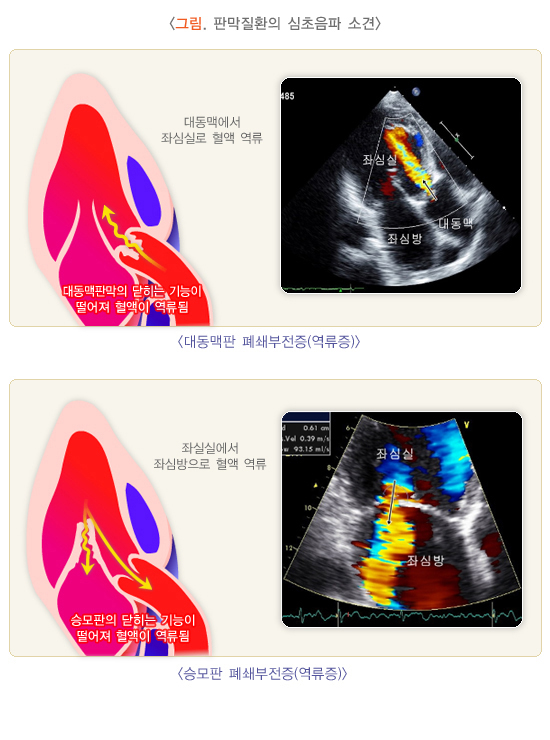 심장 내에는 혈액의 역류 방지를 위해서 4개의 판막이 존재하며, 우심방과 우심실 사이에 삼첨판막, 우심실과 폐동맥 사이에는 폐동맥 판막, 심장의 좌심방과 좌심실 사이에 승모판막과 좌심실과 대동맥 사이에 대동맥판막이 존재합니다.