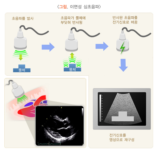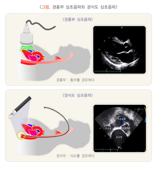 두 초음파의 원리는 같지만, 경흉부 심초음파(일반적인 심초음파)는 피검사자의 앞가슴에 탐촉자를 위치하여 검사하는 방식이며, 경식도 심초음파는 내시경을 시행하는 방법과 같이 식도 내로 탐촉자를 삽입하여 심장을 검사하는 방식입니다.