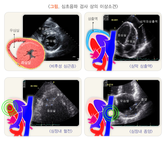 심장을 싸고 있는 심장막이 두꺼워지거나, 삼출액이나 염증이 있는 경우 쉽게 진단이 가능합니다. 또한, 심장 내에 혈전이나 종양이 발생한 경우 심초음파를 통해 쉽게 진단할 수 있습니다.