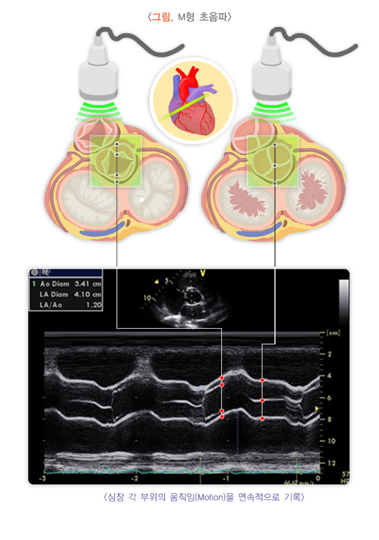 일직선으로 초음파를 보내며, 그 선상에 놓여 있는 조직에서 반사되는 초음파를 심장의 주기에 따라 연속적으로 기록합니다. 주로 각 구조물의 두께와 깊이 등을 측정하는 데 유용합니다.