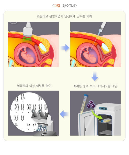 임신 15주 이후에 임신부의 복부를 통해 바늘을 넣어 양수를 채취합니다. 양수를 채취하여 양수 안 태아 세포를 배양 후 염색체 분석을 하게 됩니다.