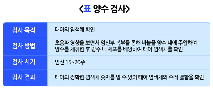 양수를 채취하여 양수 안 태아 세포를 배양 후 염색체 분석을 하기 위한 검사입니다. 염색체의 수와 구조적 문제 뿐 아니라 특정 유전 질환을 진단하기 위해 시행하기도 합니다.