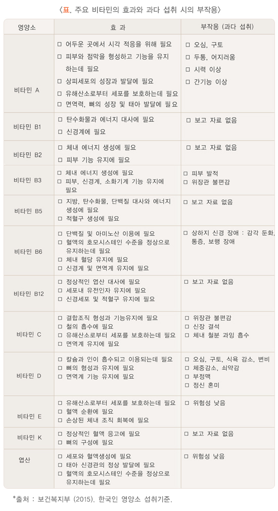 비타민은 크게 수용성 비타민과 지용성 비타민으로 나눌 수 있습니다. 수용성 비타민은 비타민 B1, B2, B3, B6, B12, C, 엽산 등을 포함하며, 섭취 시 필요한 만큼 사용되고 나머지는 소변을 통해 체외로 배출되므로 과량 복용 시에도 큰 문제가 생기지 않습니다. 반면에 지용성 비타민은 비타민 A, D, E, K를 포함하며, 과량 섭취 시 잉여 비타민이 체내 축적되어 여러 가지 부작용을 초래할 수 있으므로 결핍뿐만 아니라 과잉 섭취에도 주의해야 합니다. 또한 비타민은 음식을 통해 섭취할 때에는 과잉 섭취의 위험이 거의 없으나, 영양제의 형태로 복용할 때에는 과잉 섭취의 가능성이 있으므로 각별한 주의가 필요합니다.