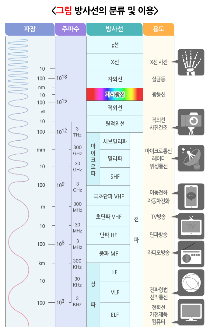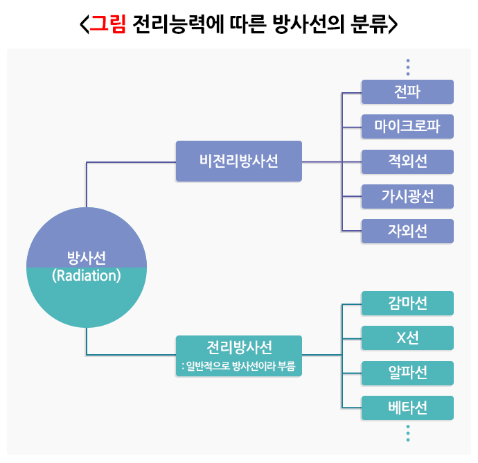 방사선은 전리방사선과 비전리방사선으로 구분합니다. 흔히 이야기하는 전자파는 비전리방사선에 해당합니다(마이크로파와 전파).