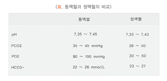 산도, 이산화탄소 분압, 산소 분압을 직접 측정하며 중탄산염, 용존 이산화탄소(dCO2), 총 이산화탄소 등은 기기에서 자동으로 계산됩니다. 혈액가스검사의 측정을 위한 검체로는 헤파린 처리된 주사기로 채혈된 전혈이 주로 사용되며 적절한 채혈과 검체의 관리가 매우 중요합니다. 이 지표들의 참고범위는 아래 표와 같습니다. 검체가 공기에 접한 경우 산소 분압은 증가하고 이산화탄소 분압은 감소한 결과를 보이며 장시간 방치한 경우 혈구세포의 대사로 인해 산소 분압은 감소하고 이산화탄소 분압은 증가한 결과를 보이게 됩니다.