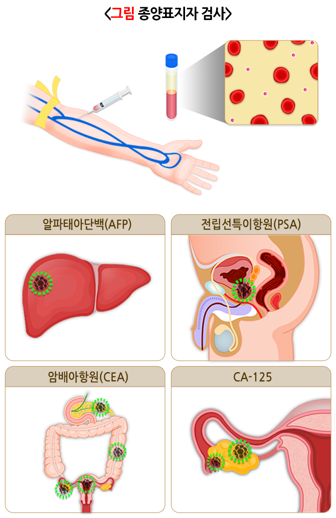 1) 선별: 악성종양의 위험요인이 있는 경우, 간암의 선별을 위해 알파태아단백(α-fetoprotein, AFP) 검사를 시행하며, 전립선암 선별에는 전립선특이항원(prostate specific antigen, PSA) 검사를 시행합니다.