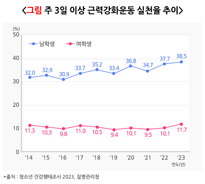 국내 청소년건강행태조사에서도 남학생의 주 3일 이상 근력강화 운동 실천율이 여학생에 비해 더 높았으며, 지속적으로 증가하는 추세입니다. 이는 청소년의 운동 실천율 증가 측면에서는 긍정적이지만, 건강보조제를 남용하게 되는 것은 문제가 될 수 있습니다.