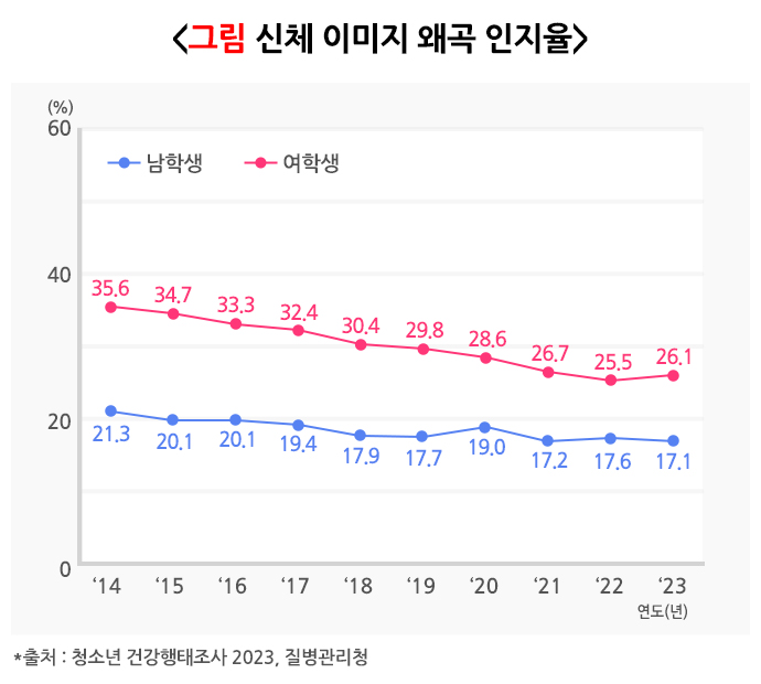 2023년 청소년건강행태조사에 따르면, 정상 체중임에도 자신을 살이 찐 편으로 인식하는 신체 이미지 왜곡 인지율은 21.7%였으며, 이 중 여학생이 26.1%로 남학생(17.1%)보다 높았습니다. 또한 조사에 응답한 청소년 중 34.4%가 최근 한 달 동안 체중 감량을 시도한 경험이 있다고 답했으며, 여학생(43.8%)이 남학생(25.6%)에 비해 체중 조절 시도 비율이 더 높았습니다.
