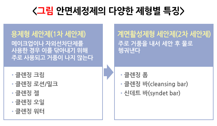 세안 제품은 크게 두 가지로 나뉩니다. 물 없이 얼굴에 바른 후 닦아내는 용제형 세안제로, 클렌징 로션이나 크림 같은 1차 세안제가 있으며, 물과 함께 사용해 거품을 내는 계면활성제형 세안제로, 클렌징 폼과 같은 2차 세안제가 있습니다.