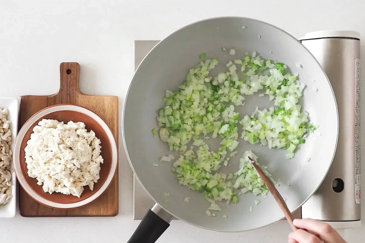 다진마늘, 대파, 양파를 넣고 2분간 볶아주세요.