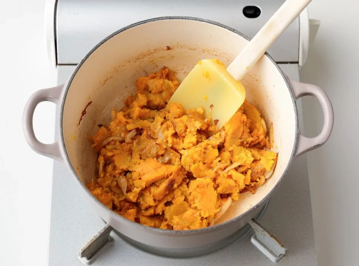 양파가 골고루 볶아지면 으깬 고구마를 넣어 섞어주세요.