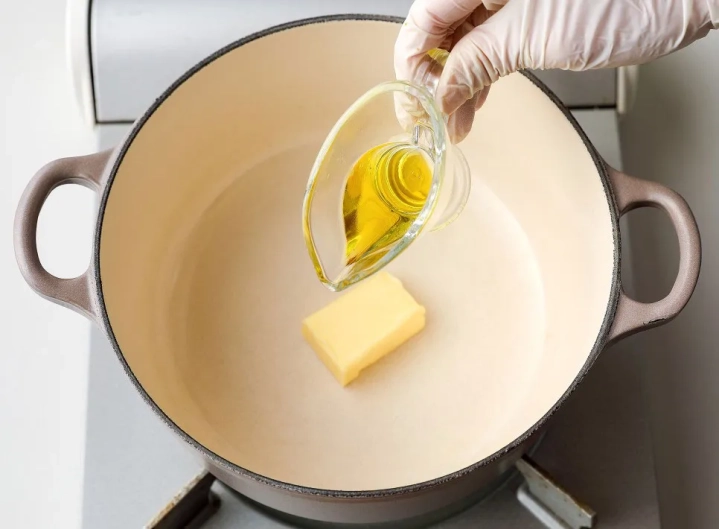 약불로 달군 팬에 버터를 녹여주고 올리브유를 더해주세요.