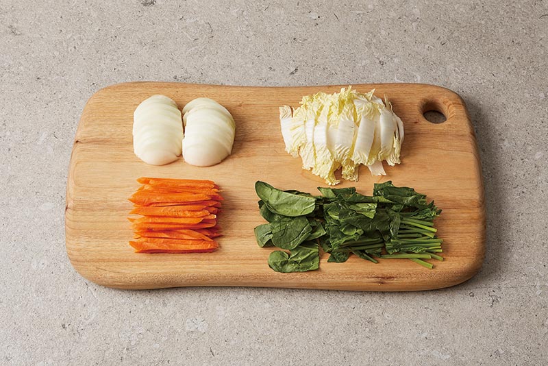 [재료]: 당면 200g, 양파 1개, 당근 1/3개, 시금치, 배추