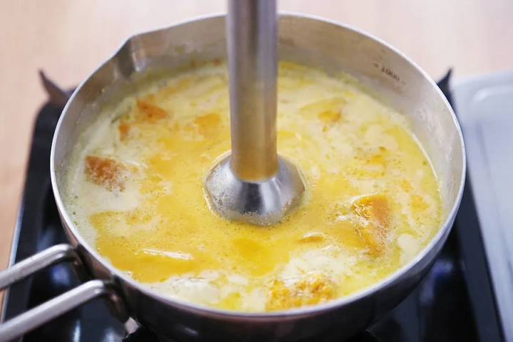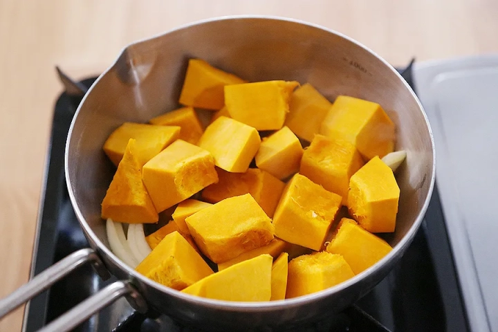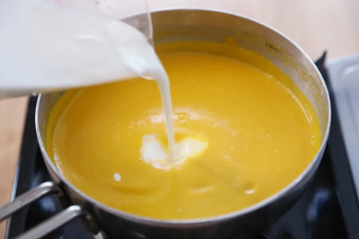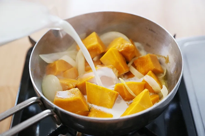 단호박이 무르기 시작하면 우유를 부어 뚜껑을 닫고 끓여주세요.