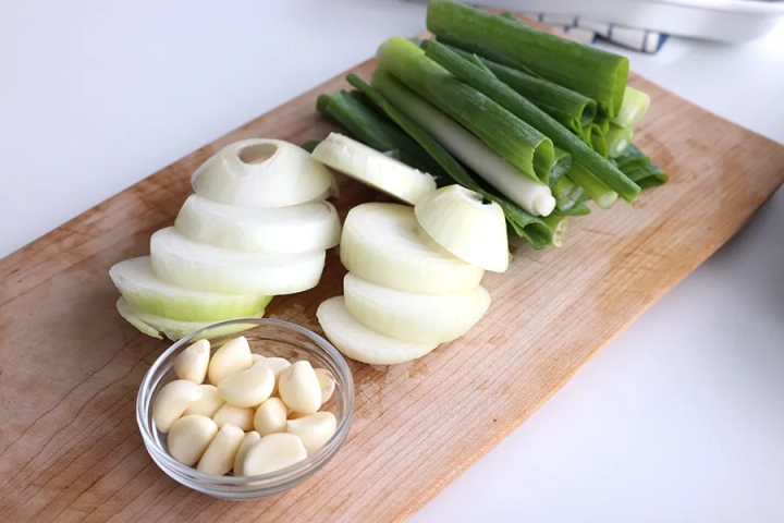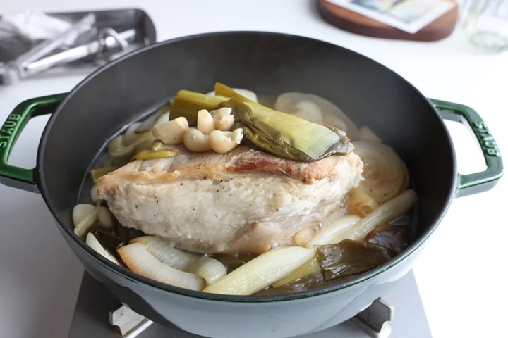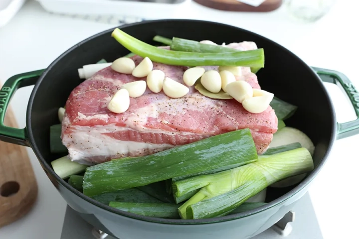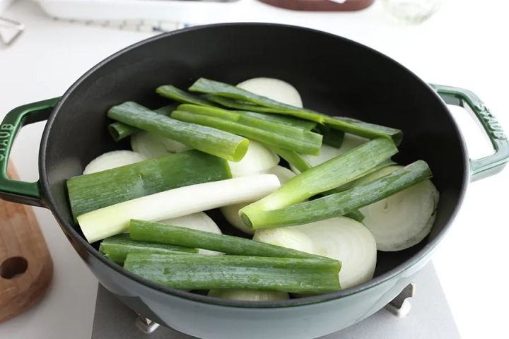 두꺼운 무쇠솥에 양파와 대파를 먼저 깔아주세요.