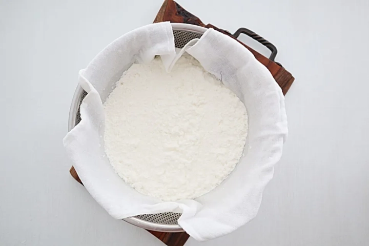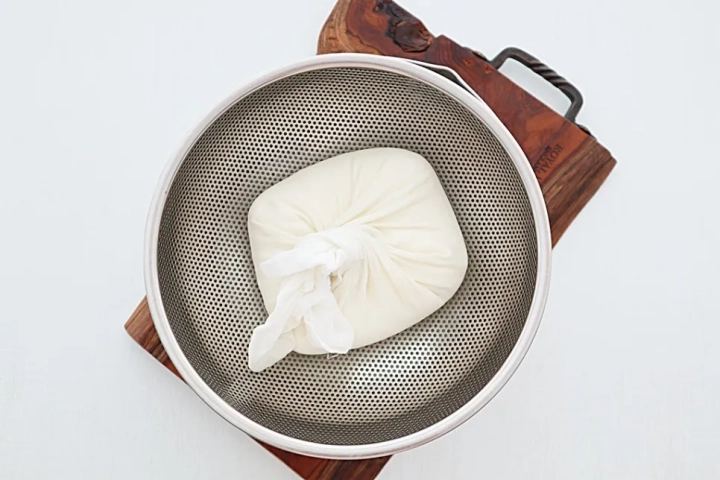 유청만 흘러나오도록 위쪽은 고무줄로 묶어주세요.