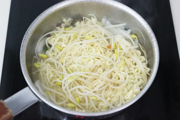 물이 끓어오르면 양파와 콩나물을 넣어 뚜껑 열고 삶아주세요.