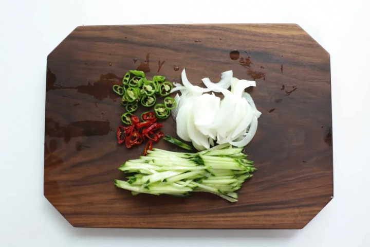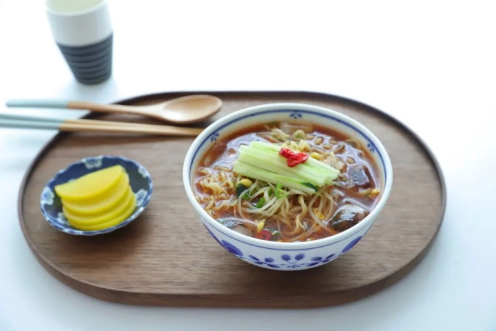 [재료]: 라면 1봉지, 콩나물 1줌, 양파 1/4개, 오이 1/2개