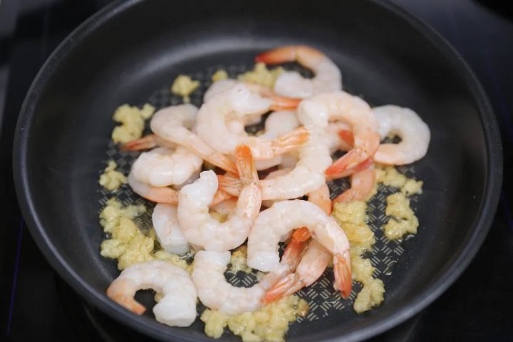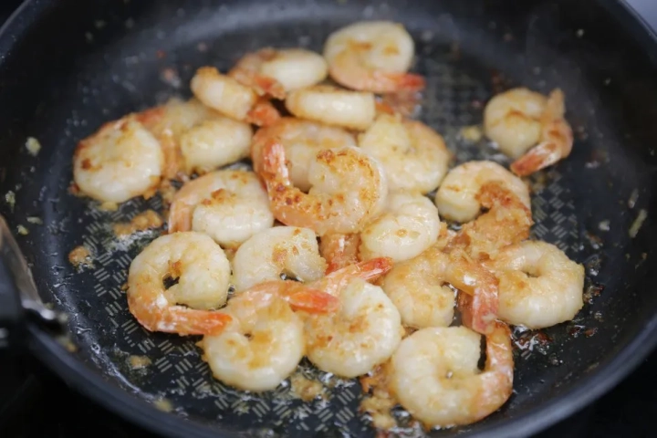 마늘 향이 올라오면 새우를 넣고 볶아주세요.
