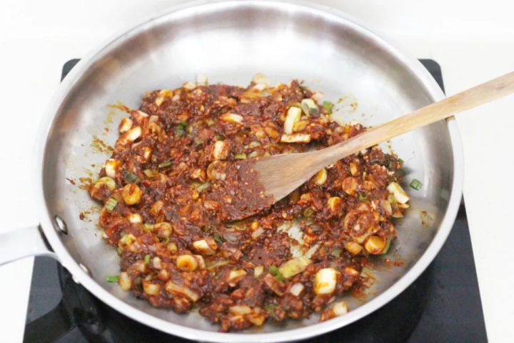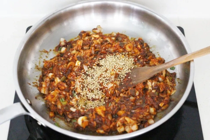 물을 살짝 더해 골고루 풀어주면서 볶아주세요.