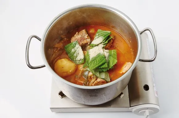 [재료]: 돼지등뼈 1.5KG, 얼갈이 1단, 감자 1개,