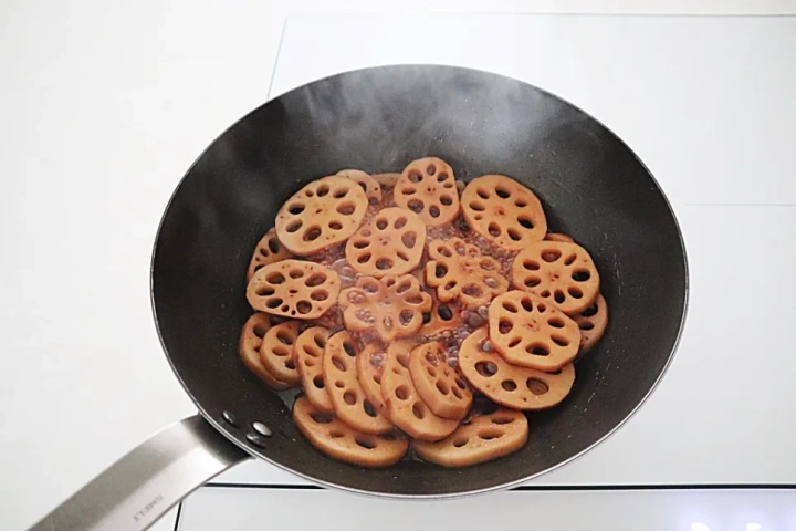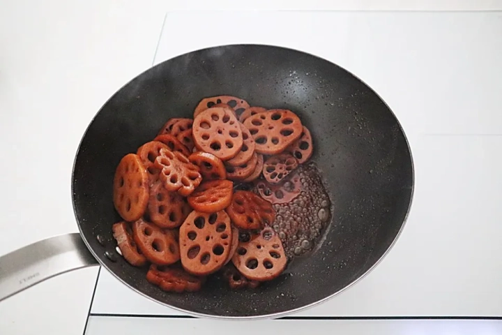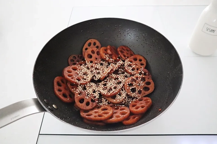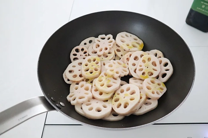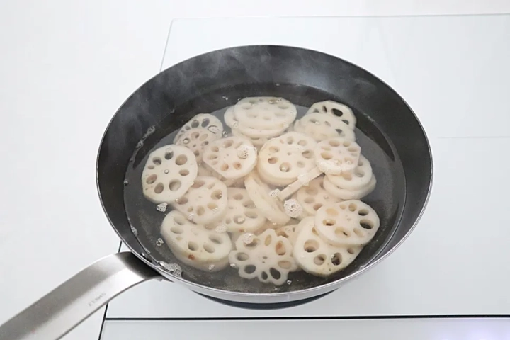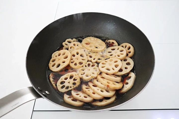 팬에 기름을 두르고 삶은 연근을 볶아주세요.