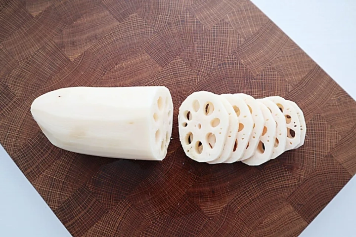 껍질을 벗긴 연근은 적당한 두께로 썰어주세요.